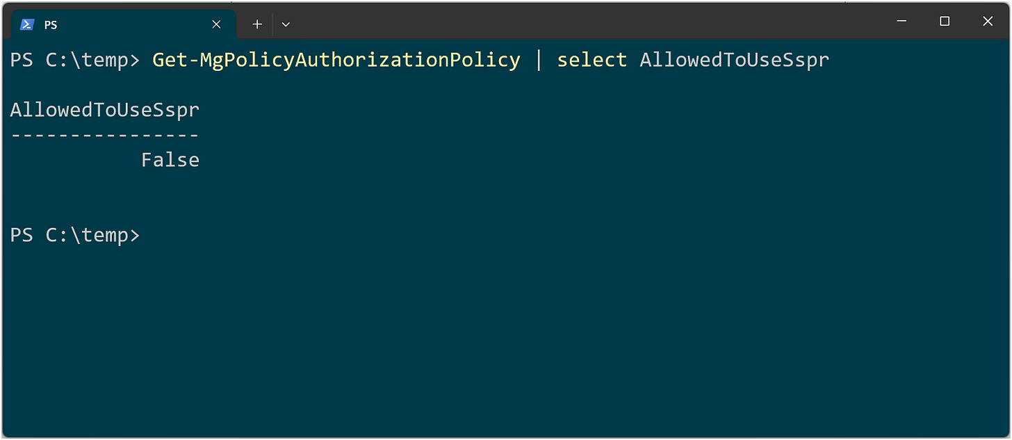 Get-MgPolicyAuthorizationPolicy | select AllowedToUseSsprTo disable SSPR for administrators, we need to set the value to FALSE.